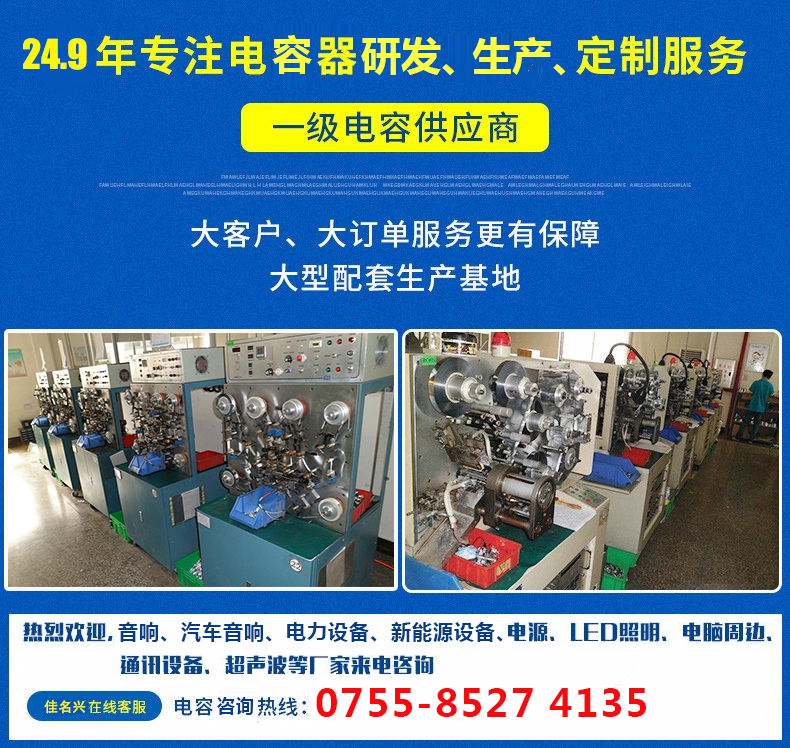 JMX電容為上千家客戶提供電容近20年,JMX電容已成為優(yōu)質(zhì)的電容供應(yīng)商之一,熱誠歡迎各界朋友蒞臨佳名興電容器工廠參觀,指導(dǎo)和業(yè)務(wù)洽談。電容器訂購熱線:+86 13927412413,了解電容器參數(shù):m.wcyaojia.com |